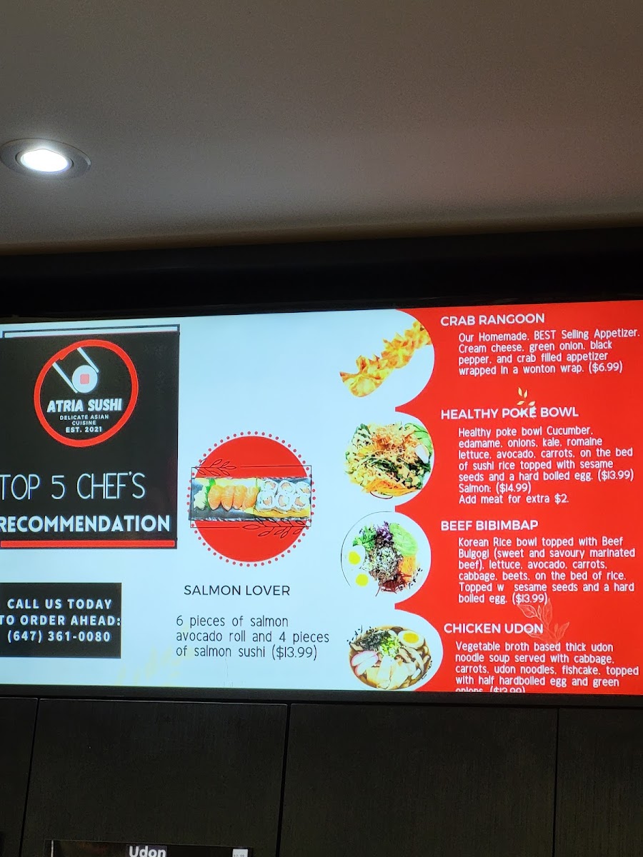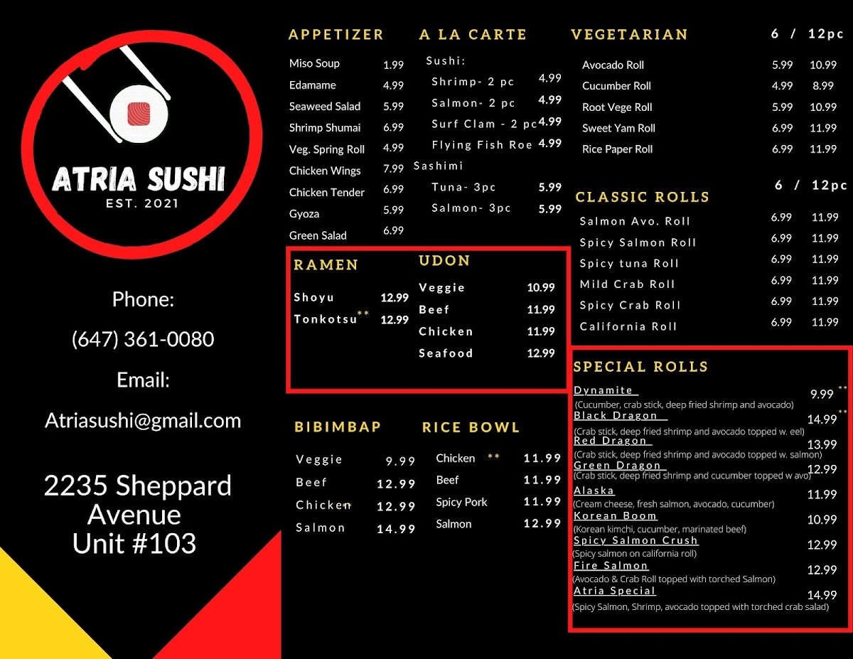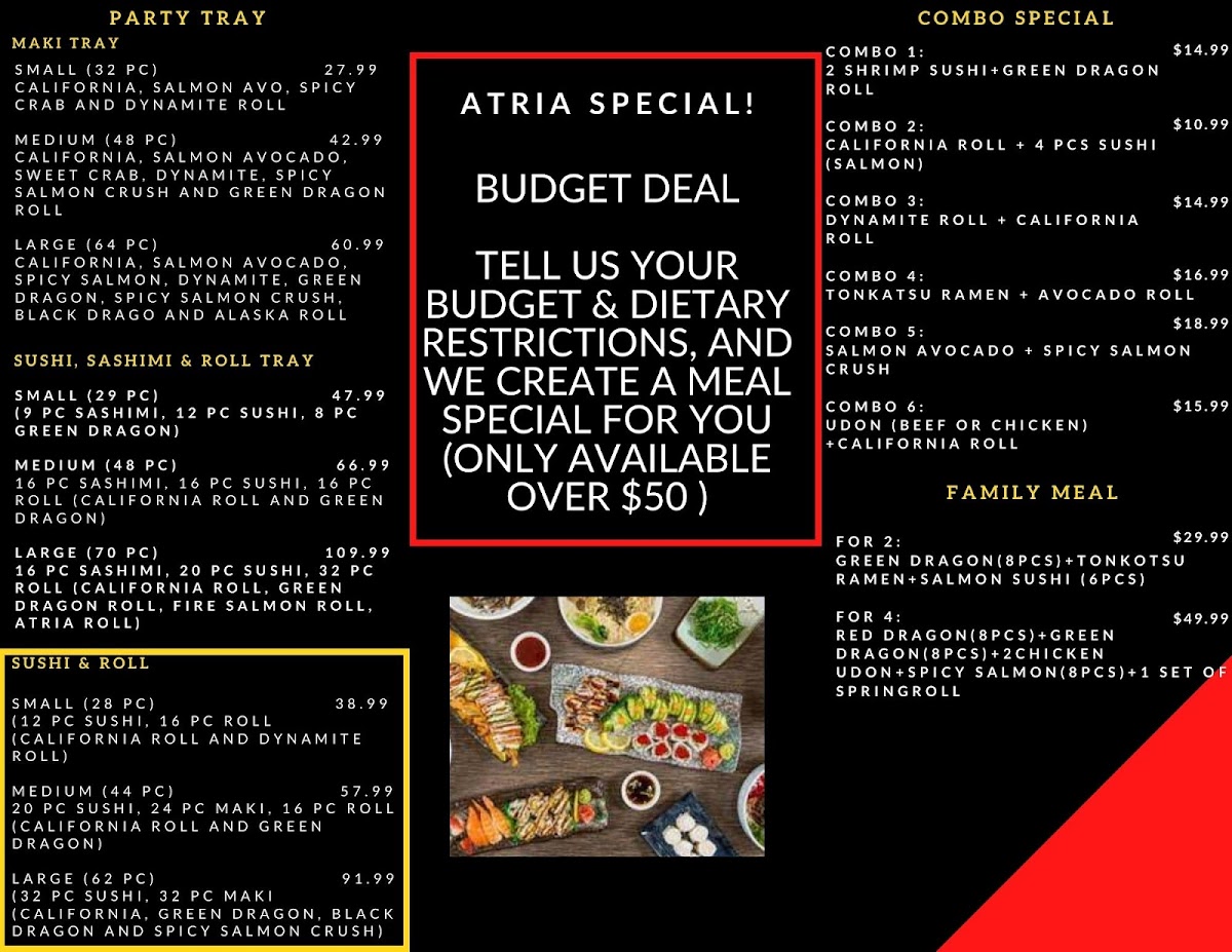 As a reviewer looking back on the full menu at Atria Sushi, I find it to be a well-rounded and thoughtfully curated selection that brings comfort, variety, and value together in one place. The experience begins gently with appetizers like Miso Soup, Edamame, Seaweed Salad, Shrimp Shumai, and Veg. Spring Roll, which set a familiar and satisfying tone. For heartier options, the kitchen delivers warmth and depth through noodle dishes such as Shoyu Ramen and Tonkotsu Ramen, while Korean-inspired bowls like Veggie Bibimbap, Beef Bibimbap, Chicken Bibimbap, and Salmon Bibimbap add balance and bold flavor. The menu continues to impress with comforting staples including Veggie Udon, Beef Udon, Chicken Udon, and Seafood Udon, as well as filling rice bowls like Chicken Rice Bowl, Beef Rice Bowl, Spicy Pork Rice Bowl, and Salmon Rice Bowl. Vegetarian diners are clearly well considered, with clean and refreshing rolls such as Avocado Roll, Cucumber Roll, Root Vege Roll, Sweet Yam Roll, and Rice Paper Roll. Sushi lovers can enjoy familiar favorites like Salmon Avo. Roll, Spicy Salmon Roll, Spicy Tuna Roll, Mild Crab Roll, and Spicy Crab Roll, or explore more adventurous flavors through special creations including Dynamite, Black Dragon, Spicy Salmon Crush, Fire Salmon, and Korean Boom. For groups or celebrations, the Maki Tray offers a convenient sharing option, while value-driven sets such as Combo 1: 2 Shrimp Sushi + Green Dragon Roll, Combo 2: California Roll + 4 Pcs Sushi, Combo 3: Dynamite Roll + California Roll, Combo 6: Udon (Beef Or Chicken) + California Roll, and Combo 4: Tonkatsu Ramen + Avocado Roll bring together some of the menu’s highlights. Rounding things out are additional favorites like Shrimp, Surf Clam, Tuna, Salmon Lover, and Crab Rangoon, leaving the overall impression of a menu that is generous, approachable, and designed to satisfy a wide range of tastes in one cohesive dining experience.